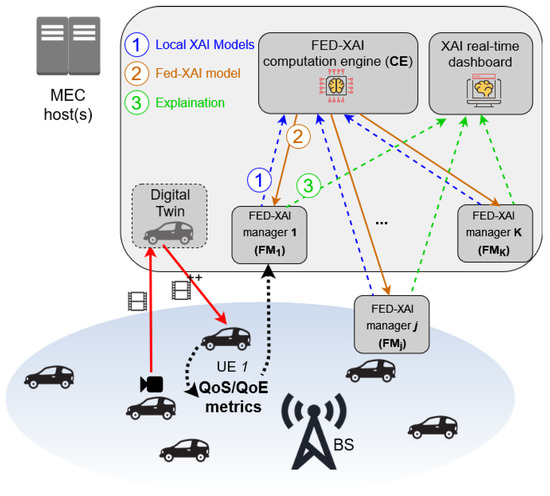 The objective of the envisioned application is to employ XAI models, learnt (and updated) in a federated fashion based on QoS/QoE data, to predict the QoE perceived by UEs in the near future. Notably, it has been recently shown that highly interpretable tree-based models are able to achieve competitive performance in this specific task [21]. In the following, we describe how the FED-XAI approach can be deployed on a MEC-enabled B5G/6G architecture (see Figure 2). A FED-XAI computation engine (CE) instantiated within an edge/cloud node (also called a MEC host) is the central entity responsible for model aggregation. With reference to the see-through scenario in Figure 2, each UE measures QoS and QoE metrics, while receiving the video stream, possibly enhanced by the DT. Examples of relevant metrics are: received throughput, jitter, packet error rate (QoS), startup delay, number of stall events and rebuffering ratio (QoE). The collected values of such QoS/QoE metrics are securely transmitted by each (vehicular) UE to a corresponding MEC application, called FED-XAI manager (FM), possibly together with any other relevant information for the FED-XAI learning algorithm. Each UE communicates with its dedicated FM, which acts as an interface to the CE in the MEC system and provides all the functionalities to allow the UE to participate in the federation, e.g., join/leave, transmit/obtain model to/from the CE, etc. Alternatively, an FM can be hosted directly at the UE (instead of the MEC host).