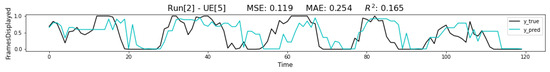 We have recently carried out a preliminary experimental analysis focused on QoE forecasting in B5G/6G networks [24]: we have presented a novel data set (QoE forecasting data set: http://www.iet.unipi.it/g.nardini/ai6g_qoe_dataset.html (accessed on 16 August 2022)) obtained through realistic network simulations and showed how decision trees as an inherently explainable model can be considered a valid baseline for the prediction task. Specifically, the data set consists of time-tagged contextual (e.g., UE position), QoS (e.g., Signal to Interference plus Noise Ratio (SINR) value measured at packet reception) and QoE (e.g., percentage of a frame arrived at the time of its display) metrics from 24 repetitions of a scenario in which 15 instances of UE experiment with a video for approximately 120 s. The prediction task has been formulated as a regression problem. The preprocessing and feature extraction steps are extensively described in [24]; in a nutshell, for each UE we collected the timeseries related to 12 metrics (QoS, QoE and contextual) and obtained any record of the preprocessed data set as follows: for a timestamp t, the input variables consist of 11 statistics (i.e., mean, median, max, min, variance, standard deviation, kurtosis, skewness, Q1 and Q3, number of samples) measured for each metric in the time window (with W = 10 s), whereas the output variable consists in the mean of the target QoE metric over the time horizon of one second (i.e., in , with H = 1 s). For the preliminary experimental analysis, we considered the centralized setting, i.e., all data available on a single node, and resorted to the decision tree for regression available in scikit-learn (https://scikit-learn.org/stable/modules/generated/sklearn.tree.DecisionTreeRegressor.html (accessed on 16 August 2022)). Figure 4 reports an example of real and predicted timeseries for a given QoE metric. Although our final goal is to learn XAI models in a federated fashion, such a preliminary analysis allowed us to set a baseline for the centralized setting and to assess the performance of an XAI model in a prediction task on realistic B5G/6G network simulations.