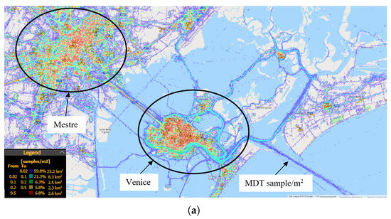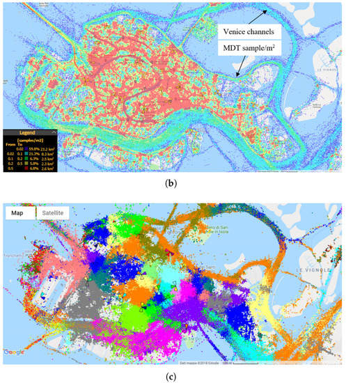 MDT georeferenced data from TIM live network on the area of Mestre and Venice cities. (a) MDT sample density (MDT ) in the area of Mestre and Venice Cities (Italy) averaged over 24 h. On the map, each single visible point is a square pixel with 1 m side. (b) MDT sample density on Venice city. (c) MDT Best Serving Cell radio coverage of Venice Cities (Italy). Each colour identifies a single cell in the 1800 MHz frequency band. On the map, each single visible point is a square pixel with 1 m side.