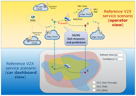 We consider an application where several instances of vehicular User Equipment (UE) connected to a B5G/6G Base Station (BS) receive a video stream whose quality plays a decisive role in the safety of remote driving. The quality of experience (QoE) perceived by UEs depends on the QoS provided by the network. This can be mapped, for instance, to a see-through use-case, where the receiving UE is a car using a live feed from the camera of another car (e.g., to make overtaking safer in the presence of visual impairments for the driver), or to ToD, where the sender is the car being driven and the receiver is the driving operator. In either case, operations may be supported by a DT of the traffic area at the edge. From an implementation perspective, Multi-access Edge Computing (MEC) infrastructure can be leveraged as an intrinsic facilitator for the segregation of data, as requested by international regulation in the matter of ITS services. Furthermore, state-of-the-art MEC technologies are defined by considering MEC security with an end-to-end approach, leveraging existing standards relevant in the area, e.g., ETSI-NFV-SEC (European Telecommunications Standards Institute—Network Functions Virtualisation—Security), TC CYBER (Technical Committee Cybersecurity), 3GPP (Third Generation Partnership Project), carefully selected to be applicable in edge computing systems.