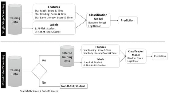 The mixed gated screening approach also consisted of two stages. The first stage involved the identification of the students who were “not at risk”, which was based on their first Star Math score in a school year. We again used the scale scores corresponding to the 30th, 40th, and 50th percentiles to identify students who were above these cut-off values and then temporarily removed these students from the training dataset. Then, in the second stage, we used the remaining students (i.e., the sample of students who were identified as being “at risk” in the first stage) and applied the Logitboost and RF algorithms to predict whether they would still be identified as being “at risk” based on their last Star Math score (i.e., whether or not their scores were above the scale score corresponding to the 25th percentile of the next grade level). Using the training dataset, the classification based on the final Star Math score was predicted based on the first Star Reading and Star Early Literacy scores and the administration times of these assessments. The prediction algorithm from the training dataset was then applied to the test dataset to make predictions and evaluate the outcomes. Students in the test dataset who were flagged either based on their first Star Math score or by the machine learning model were considered “at-risk” students. All single-stage and gated screening methods were applied to student data from the 2016–2017 and 2017–2018 academic years. Figure 1 depicts the single-stage and mixed gated screening procedures involving a binary classification model based on machine learning.