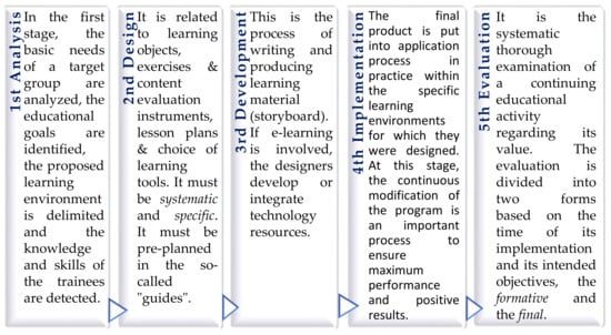 According to its basic theoretical and philosophical characteristics, the specific model—ADDIE—is widely known and recognized as a model for designing and evaluating learning experiences, courses, and educational content (e.g., Trust and Pektas [30]). This model is based on pedagogical scenarios. The ADDIE model is based on the general system’s theory/analysis, which ensures that the analysis of tasks follow a logical and smooth process (e.g., Diamantopoulou [28]), and the underlying theory for this model is the theory of behaviorism. Regarding the type of knowledge, the ADDIE model approaches procedural knowledge.