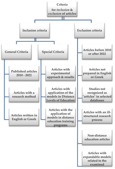 Eligibility: During the selection phase, a full text analysis is required. For this reason, the 32 articles were thoroughly studied following specific eligibility criteria, or otherwise entry criteria. The eligibility criteria were as follows: 1. The full text of the article contains a review of multiple articles; 2. The article provides evidence of educational potential based on a well-structured research method; and 3. The article includes an experimental application indicating the effectiveness or not of the examined model in distance education, whether it is courses at education levels or in the framework of an employee training program.