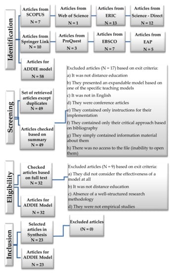 During this stage, 9 articles underwent the exclusion procedure as ineligible, while 23 articles were deemed appropriate for data extraction. In particular, of the 9 rejected articles, 2 articles did not examine the effectiveness of the specific model at all, although during the methodological process, they emphasized the development of the specific model. The 3 articles were not distance education, although they referred to virtual reality environments, multimedia classrooms, mobile learning, or TV programs without being specified in the summary in order to be rejected in the previous stage of checking their suitability (screening phase). A total of 4 articles were not empirical studies, of which 2 articles were comparative studies of ADDIE and Agile or SAM models based on the relevant literature.