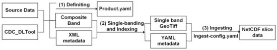 Data cubes, a new type of multisource satellite imagery data management framework, were first well-developed and promoted in countries such as Australia and Switzerland. The National Data Centre for Earth Observation Science (NODA), as the only national scientific data center in the field of earth observation science in China officially recognized by the Ministry of Science and Technology and the Ministry of Finance, plays a crucial role in the field of application services for matters of national importance. The NODA has also been following the technical development of the ODC, and proposed the creation of the CDC initiative in 2018 [39]. The goal of the CDC is to efficiently manage the massive amount of multisource international and China satellite imagery data covering the Chinese region based on the ODC, taking into account the characteristics and practical application needs of Chinese satellite imagery data, to provide a reference for relevant researchers to make quick decisions and formulate policies. In this paper, the details and processes of data loading and organizational management in the CDC are described using Landsat 8 and GF-1 data as examples, respectively, as shown in Figure 1.