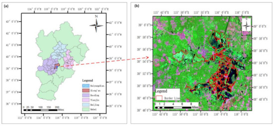 (a) The selected study area of case study one, the Baiyangdian Lake, located in the urban agglomeration of Beijing, Tianjin, and Hebei Provinces; (b) The Landsat 8 remote sensing imageries covering the Baiyangdian Lake, displayed by false color imageries using bands 7, 5, and 3 (Date: 18 September 2019).