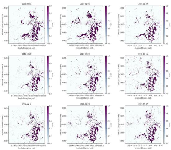 In order to test the usability of the CDC grid, based on the loaded Landsat 8 imagery data and the water body extraction algorithm WOfS [51], this study calculated the changes in the spatial distribution of water bodies in the Baiyangdian Lake, as shown in Figure 5. By comparing and analyzing the annual changes in the water bodies of the Baiyangdian Lake, a theoretical basis for dynamic changes in domestic and industrial generation can be provided. For example, from the second graph in the first row, it can be seen that there was a relatively significant increase in the volume of water in the Baiyangdian Lake in 2014, due to the introduction of external water from the South–North Water Transfer Project. As can also be seen in the third graph in the second row, there was also an incremental change in the quantity of the Baiyangdian Lake in 2018, thanks to a series of protection policies for the Baiyangdian Lake issued after the establishment of the Xiong’an New Area.