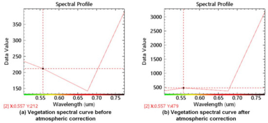 Comparison of vegetation spectral curves before and after atmospheric correction in the study area.