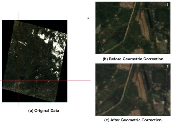 Comparison of the study area before and after geometric correction.