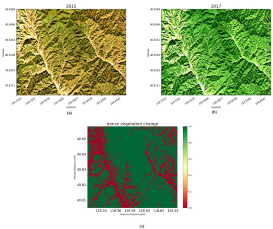 This case study is based on the NDVI (normalized difference vegetation index) values to determine the vegetation change in the same area at two different time periods. Different baseline NDVI threshold ranges can be set for different vegetation types, e.g., 0.6 to 0.9 for dense vegetation and 0.2 to 0.6 for grassland. Figure 10a,b represent the change in dense vegetation in the study area between the two time periods of 2015 and 2017, based on the GF-1 imagery data stored and managed in the CDC grid framework. This is an NDVI threshold plot showing the change in green pixels within the threshold range. Based on this map, shown in Figure 10c, it can be seen that dense vegetation changes significantly elsewhere except the ridges, which can provide a data reference for forest vegetation change studies [3].