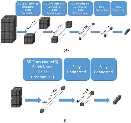 Schematic illustration of the transformation of data across the layers of the convolutional neural network for two representative patch sizes. For the largest patch size (X = 7, Z = 7) (A), the 7 × 7 × 7 × 2 input is transformed after three successive 3D convolutions of kernel size 3 × 3 × 3 without padding into a 256-element array of scalar values prior to the fully connected layers, which in turn generate the final 4-class classifier output. For the smallest patch size (X = 3, Z = 3) (B), one 3D convolution of kernel size 3 × 3 × 3 without padding is sufficient to generate a 256-element array of scalar values. 3D Conv = three-dimensional convolutional layer; Batch Norm = batch normalization layer; ReLU = rectified linear unit activation function.