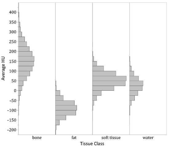 At each patch size, machine learning models were trained to identify the tissue class of the center voxel. The number of patches in the datasets used in training and individual model testing/validation varied with patch size (Table 1), such that smaller sizes allowed for the generation of more patches from the labeled ROIs, ranging from >97,000 for the smallest size of 3 × 3 × 3 × 2 to approximately 6500 for 7 × 7 × 7 × 2. There was class imbalance, with relative underrepresentation of the ‘water’ class related to difficulty obtaining large ROIs for this class. The overlap in center-pixel Hounsfield units (HU) across tissue classes for the largest of the labeled datasets (Figure 4) confirms the difficulty of HU-based thresholding methods in differentiating these tissue types.