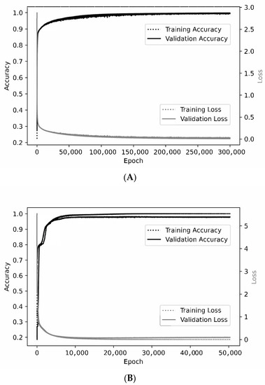 Representative learning curves. For the smallest patch size of 3 × 3 × 3 × 2 (A), the training and validation curves are nearly superimposed when assessing either accuracy or loss. At a patch size of 7 × 7 × 7 × 2 (B), optimal training accuracy and loss are slightly better than for validation.