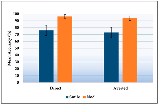Accuracy (total correct trials/total trials) for crossing intention responses was measured. “Not cross” was coded as the correct response for the angry expression, the surprised expression, the head shake, the neutral expression, and the cheek puff, regardless of gaze direction and VHC gender condition. “Cross” was coded as the correct response for the smile and the nod, regardless of gaze direction and VHC gender condition. Following the recommendation of Kaß et al. [137], the absolute criterion for effectiveness was set at 0.85 correct in each experimental condition.
