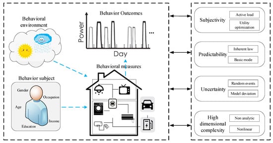 In this study, to analyze the basic characteristics of users’ electricity consumption behavior, four points were examined according to the concept and component of users’ electricity consumption behavior: subjectivity, predictability, uncertainty, and high-dimensional complexity. These features are also the basis for user behavior analysis. A typical user’s electricity consumption behavior architecture is shown in Figure 2.