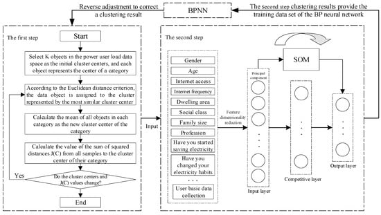 - In order to solve the problem of poor clustering under the complex electricity consumption situation of users in the existing research, we constructed a two-step clustering model based on the principle of reverse regulation. Our method can improve the poor clustering results of previous research that only adopted the first step of clustering based on a k-means clustering algorithm or the second step f clustering based on self-organizing competitive neural networks.