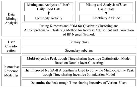 - In order to solve the problem that the single demand response strategy in the existing research is unable to effectively interact with the user side, we propose an interactive demand response optimization strategy based on two-step clustering. According to the clustering results of resident users, the peak and valley periods are determined by the primary class, and the peak–valley load time-sharing incentives are customized by the secondary subclass.