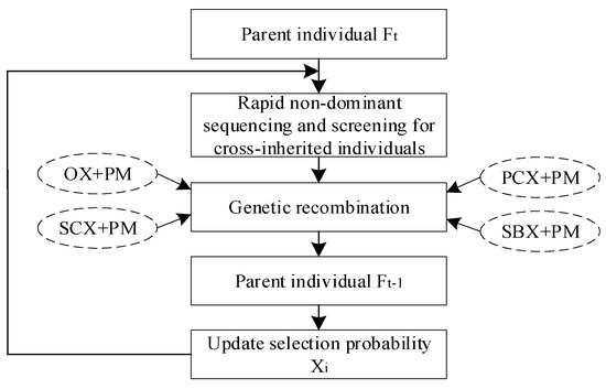 In the optimization iteration process of the algorithm, the selection probability of the gene recombination operator is iteratively updated to utilize the advantages of each recombination operator in different periods as much as possible. Therefore, a feedback route map of the gene recombination operator, as shown in Figure 5, was established to improve the NSGA-II algorithm.