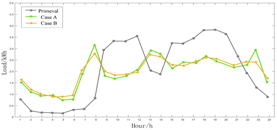 A residential user was randomly selected from the dataset of this paper. Figure 8 shows the comparison of the load curve of the user under the two cases. Compared with the user’s original load curve, the load values of Case 1 and 2 fall back during the peak load period and rise in the trough load period, and the overall load curve tends to be gentle compared with the original load curve. Among the cases, Case 2 has the stronger load stability and more obvious optimization effect, proving the effectiveness of the method proposed in this paper and the necessity of considering the multidimensional influencing factors of users’ electricity consumption behavior. Table 2 compares the electricity consumption costs to the user under the two cases. Case 1 saves CNY 1.79, while Case 2 saves CNY 2.28. It should be noted that in order to verify the advantages of the demand response strategy proposed in this paper, we conducted a comparative analysis of the relative values. The absolute values of the actual situation varied according to the different user groups. Therefore, it can be concluded that Case 2 takes into account the two objective functions and has better optimization performance.