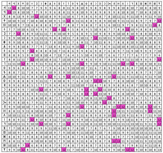 A similarity matrix of the Old Hungarian Runic signs. Entries that indicate a similarity of 12 or 13 between two different signs are highlighted in pink.