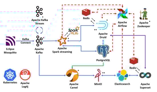 Eclipse Mosquitto (mosquitto.org, accessed on 22 June 2022) is a MQTT server that collects data from sensors of origins and stores them in individual topics in binary, plain text or json form, Apache Kafka (kafka.apache.org, accessed on 24 June 2022), a message queue widely used to temporary store data before or after their processing. Apache Spark Streaming (spark.apache.org, accessed on 28 June 2022) is implemented to process streams of data while the MLlib library achieves Machine Learning analysis. At the end, the data are stored in function of the type of data in a polystore composed of multiple databases (Apache Druid & PostgreSQL). Apache Camel (camel.apache.org, accessed on 22 June 2022) is an integration framework that empowers integration of various systems consuming or producing data. MinIO (min.io, accessed on 22 June 2022) is high-performance, S3 compatible object storage. ElasticSearch (elastic.co, accessed on 24 June 2022) is a software using Apache Lucene (lucene.apache.org, accessed on 24 June 2022) for indexing and searching data. Apache Airflow (airflow.apache.org, accessed on 24 June 2022) is a platform to programmatically author, schedule, and monitor workflows. Apache Superset (superset.apache.org, accessed on 25 June 2022) is a data exploration and visualization platform. PostgreSQL (www.postgresql.org, accessed on 28 June 2022) is a powerful, open-source object-relational database system. Apache Druid (druid.apache.org, accessed on 27 June 2022) is a real-time database to power modern analytic applications. Redis (redis.io, accessed on 25 June 2022) is an open source, in-memory data store. Apache Zookeeper (zookeeper.apache.org, accessed on 25 June 2022) is a centralized service for maintaining configuration information, naming, providing distributed synchronization, and providing group services. Kubernetes (kubernetes.io, accessed on 25 June 2022) is an open source system for automating the deployment, scaling, and management of components in a containerized architecture. Apache Log4j (logging.apache.org/log4j/2.x, accessed on 25 June 2022) is a Java-based logging utility.