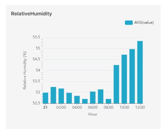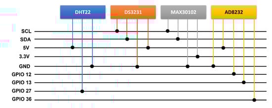 Islam et al. [] developed a smart healthcare monitoring system based on IoT. Their system is composed of three modules: the sensor module, the data processing module, and the web user interface. The data processing module is composed of ESP32 processor, which is the heart of their system. The ESP32 processor offers a full Linux system on a small platform for a very low price. Their results for the heart rate were in a range between 68–83 bpm, for the body temperature, in a range between 36.1 and 37.0 , and for the room humidity, in a range of 60% to 72% [].