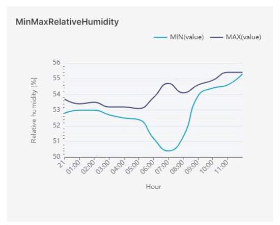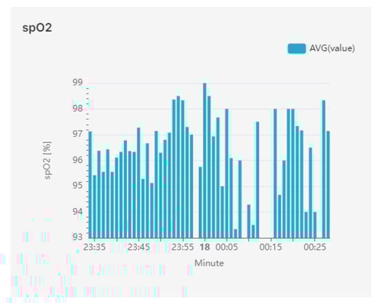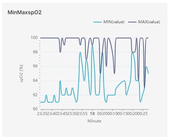 Ramírez López et al. [] proposed an IoT architecture in healthcare monitoring to enhance acquisition performance of respiratory disorder sensors. Their architecture is composed by three modules: the Wireless Personal Area Network (WPAN) acquisition module composed by a body temperature sensor and a CMS50DL Pulse Oximeter. The transmission module is composed by Arduino UNO and Raspberry Pi Model 3B (RPIi3B) programmable cards. The Hub-IoT (NoSQL DB, cloud broker) is used to store and to process data. As a result, they obtained for spO2, a range between 95% and 97%, for the heart rate, a range between 86–100 bpm, and for the body temperature, a range of 35.5 to 37.0 [].
