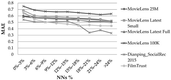 Figure 1 illustrates the MAE observed for the six aforementioned dense datasets, considering the NN% feature and using the PCC user similarity metric.