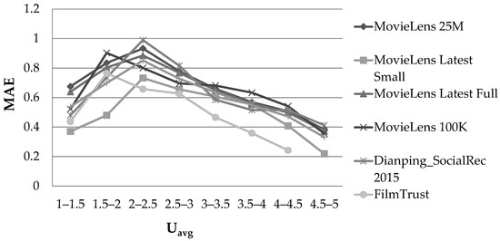 Figure 2 illustrates the MAE observed on the datasets, considering the Uavg feature and using the PCC user similarity metric.