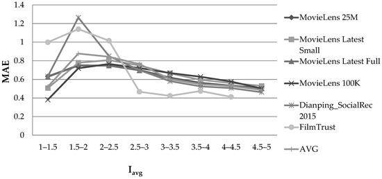 Figure 3 illustrates the MAE observed on the datasets, considering the Iavg feature and using the PCC user similarity metric.