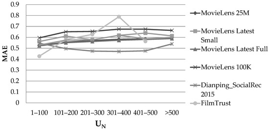 Figure 4 illustrates the MAE observed on the datasets, considering the UN feature and using the PCC user similarity metric.