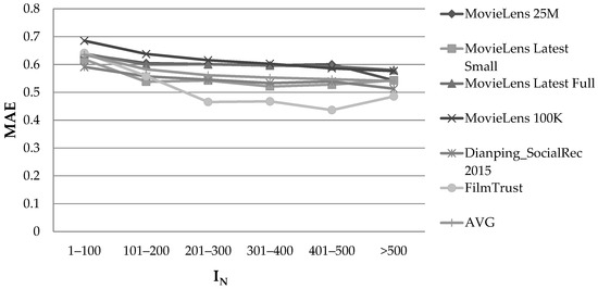 Figure 5 illustrates the MAE observed on the datasets, considering the IN feature and using the PCC user similarity metric.