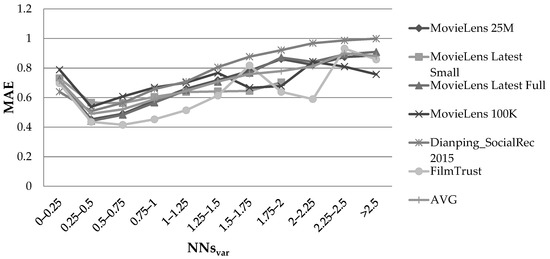 Figure 6 illustrates the MAE observed on the datasets, considering the NNsvar feature and using the PCC user similarity metric.