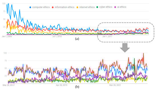 (a) Top: Google Trends search percentage for “computer ethics”, “information ethics”, “internet ethics”, “cyber ethics”, and “AI ethics” since 2004. (b) Bottom: Trends between 2017 and 2022.