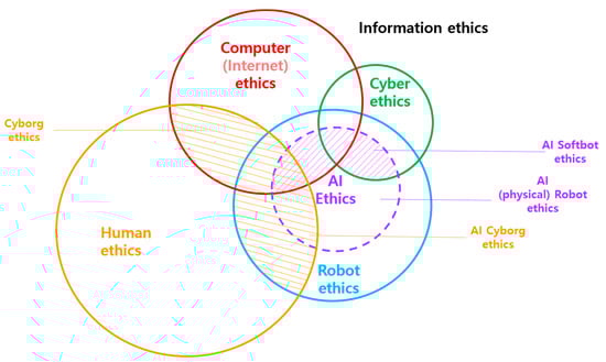 Not long after, Hauptman [] coined the term information ethics, which included all ethical issues related to the production, storage, access, and dissemination of information, including literacy and media. Based on previous studies, Wong [] defined computer ethics as ethics for both computers and information technology and stated that there was no significant difference between computer ethics and other types of ethics related to computing. Spinello and Tavani [] wrote that cyber ethics was a larger concept than information ethics and internet ethics, but Froehlich [] considered cyber ethics to be a particular area of computer ethics that included AI and robots. Floridi [] proposed an information ethics framework that provided a metaphysical basis for computer ethics that was different from Wiener’s materialistic and physical concepts. The metaphysical concept encompassed all objects in the universe (humans, animals, objects, robots, softbots, cyborgs, etc.), going beyond the focus on humans in traditional ethical theories.