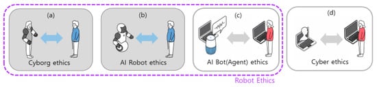 According to Tzafestas [], the academic history of robot ethics begins with the European Robot Research Network (EURON). He argued that ethics-based robot design and legislation are needed through such a research network with experts in various fields (computer/robot/mechanical/automation/AI engineers, cognitive scientists, philosophers, and ethicists) and presented detailed explanations of roboethics branches: medical roboethics, assistive roboethics, sociorobot ethics, war roboethics, autonomous car ethics, and cyborg ethics. These branches take into consideration robots that can interact physically but do not include softbots in virtual space. Malle [] divided robot ethics into two categories: the problem of designing, arranging, and utilizing robots and the problem of their moral ability. Reader and Savin-Baden [] divided robot ethics into robot rights, using Floridi’s [] metaphysical perspective and interaction-based ethics from a general point of view.