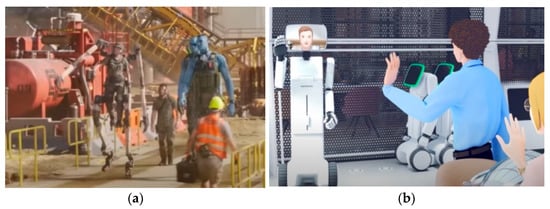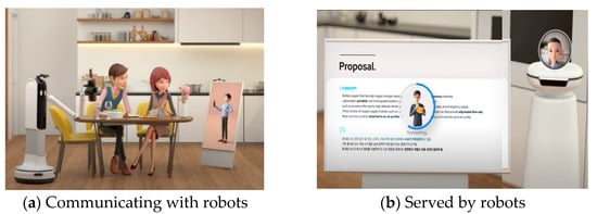 In this section, examples from two animated shorts and a movie envisioning a future society are classified according to the proposed information ethics framework. In the first example, two robots, Bot i and Bot Handy, which appeared in Samsung’s future home animations from CES 2022, illustrate different facets of the conceptual framework. Bot i is a medium-sized information-providing robot that connects people primarily through human-to-human communication services such as SNS and email, while Bot Handy is a robot that provides physical services, such as delivering water. In Figure 4a, the AI avatar in Bot i’s monitor translates an email that the user receives. If the sender of the email has sent a file that infringes on the copyright, the situation can be classified under cyber ethics, and the main stakeholders become the sender and receiver of the email. If the AI avatar misinterprets transmitted email content based on biased data, the situation can be classified under AI ethics. Bot i also detects if users are at home and connects them with callers for real-time meetings. If a problem occurs involving recording, transmitting, or hacking without user consent during a real-time meeting, it falls under cyber ethics.