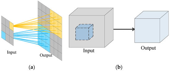 In order to be able to extract feature information in the temporal dimension of video data or multi-frame images, Simonyan et al. [28] proposed a dual-stream convolutional neural network, but this method requires a lot of time to calculate the optical flow map in advance, and the optical flow map will contain many invalid motion features. In contrast, C3D in deep learning algorithms can learn end-to-end to achieve the extraction of motion features. In particular, the C3D proposed by Tran et al. [20] adds convolution to the temporal dimension of video data and can extract spatial features and motion features simultaneously. Compared with a 2D convolution network, C3D adds an extra time dimension to the input data and convolution kernel, and multiple consecutive video frames form a cube as the input. Then, the C3D convolution kernel is used in the cube, and each feature graph in the convolution layer is extracted from multiple consecutive frames in the previous layer. Therefore, C3D convolution captures motion information and is suitable for behavioral recognition tasks. The 2D convolution and C3D operations are shown in Figure 1.