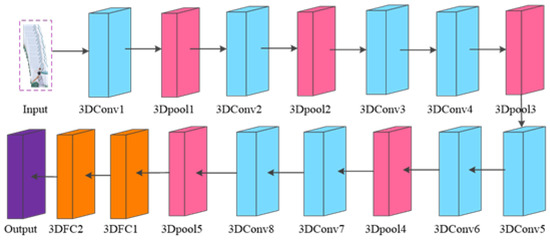 The C3D network is a deep convolutional neural network with a total of 10 layers, including 8 convolutional layers and 2 layers of fully connected layers. Firstly, the network starts with a 3-channel, 16-frame video image with an image size adjusted to (112 × 112) as input. Then the key feature information in the video image is extracted by network training. Finally, the extracted features are input to the later two-layer fully connected layer for feature classification, and the classification probabilities of each human action category in the video are output by a Softmax classifier. The overall structure of the C3D neural network is shown in Figure 2.