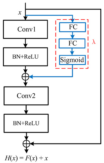 In deep learning networks, the more layers there are, the more detailed and comprehensive data feature extraction. However, the increase in network layers will easily lead to over-fitting and network degradation. In order to avoid the above problems, He et al. [29] proposed a structure that can optimize network training—Residual Networks. The core idea of Residual Networks is Residual connection and identity connection so that the input signals of deep networks learn new features by the Residual connection structure. The identity connection structure is used to preserve the original input characteristics so that the performance of the deep neural network will not be degraded. The structure of the residual block is shown in Figure 3. The mapping relationship is mathematically represented as: