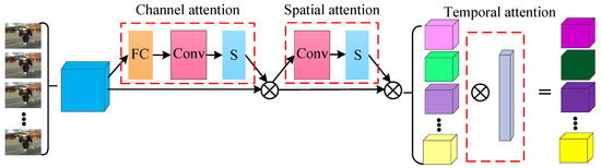 Finally, in order to find out the key frames from the video frames of the feature map after feature refinement, a temporal attention mechanism is used to distinguish the key video frames as shown in Equation (4). The final spatiotemporal channel attention feature map was obtained from the original feature map after adaptive feature refinement.