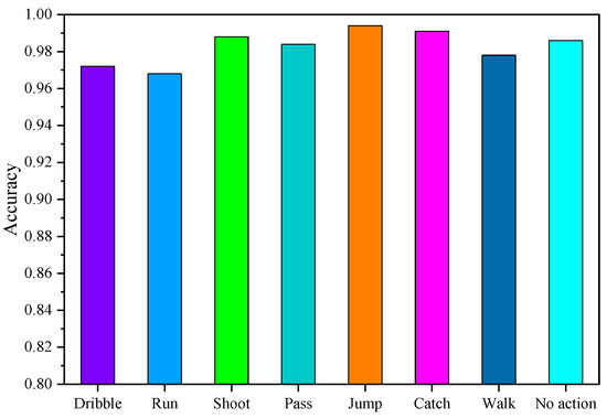 In order to verify the effectiveness of the proposed method in this paper, the method is used to recognize different basketball actions: dribbling, running, shooting, passing, jumping, catching, walking, and no action. The experiments show that the proposed method in this paper is more efficient in recognizing basketball actions. As can be seen from Figure 8 the recognition accuracy rates of eight basketball actions are over 96%, and the recognition rate of the whole basketball action is as high as 98.26%. Specifically, the recognition accuracy rate of jumping basketball action is up to 99.27%. The recognition accuracy rate of running basketball action is 96.74%. This result is mainly because the proposed method can fully extract the feature information for action recognition mainly through the improved residual network, and then the improved attention mechanism can efficiently cull the feature information that is beneficial for action recognition. In summary, the method proposed in this paper improves the accuracy of different basketball action recognition through a dynamic residual network and improved attention mechanism.