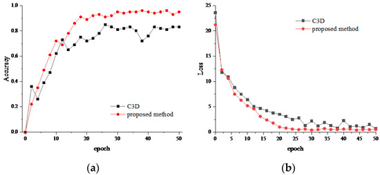 To evaluate the performance of the proposed method in this paper, experimental comparisons with traditional C3D convolution are performed, and the accuracy and loss function results of the experimental training are shown in Figure 9.