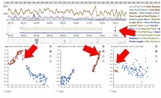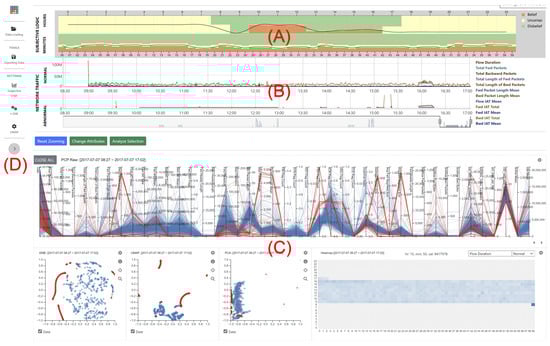 To understand the difference between the attacks that appeared on Day-5, we created several scatterplots by selecting different time ranges by referencing the CICIDS2017 dataset description as 10:02–11:02 (Botnet ARES), 13:55–15:29 (port scan), and 15:56–16:16 (DDoS LOIT). When comparing the scatterplots of t-SNE and UMAP, we could not find any major difference between normal and abnormal activities. However, with PCA projections on scatterplots, we found a clear distinction between normal and abnormal. Figure 7 shows examples of PCA projections with DWT features in different time ranges. In addition, based on our analysis of understanding the difference between normal and abnormal patterns, we found unknown attacks in the time range of 11:03–12:59. These unknown attacks were not mentioned anywhere in the dataset description. Figure 7D represents unknown attacks (highlighted in red) overlaid with other network traffic activities (colored gray and blue) in 8:46–13:22. The highlighting was performed by the user within the parallel coordinates plot.