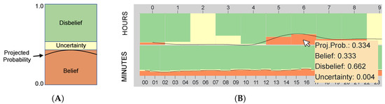 Binomial opinions of network events are represented with stacked bar graphs with different colors as belief (orange), disbelief (green), and uncertainty (yellow). (A) represents a schematic diagram of the stacked graph. (B) shows a representation of quantified uncertainty in every hour (00∼09) and minute (00∼23). Height indicates the amount of belief mass in supporting the truth of attack state x being true, false, uncommitted condition, accordingly.