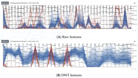 In the parallel coordinates plot, all network traffic data that appeared within the selected date and time range in the Network View are represented. In the plot, variables are represented as vertical bars to denote axes [53,54]. Figure 3 shows examples of user-selected data for the raw and DWT features on Day-3 (7 May 2017). The representation of the raw features (Figure 3A) does not show any distinctive network traffic patterns. This would be because network traffic data often maintain complete randomness in the distribution of cyberattacks [55]. This randomness is somewhat diminished when using the DWT features by making network traffic patterns visible (see Figure 3B). To help the user control the features and variables in the parallel coordinates plot, selecting network events is supported. Based on the user’s selection, corresponding network events are highlighted in multiple scatterplots. Furthermore, the selected events in the scatterplots become highlighted in the parallel coordinates plot. This feature is critical to increase the understandability of data. In the plot, axis translation [54] is also supported to help the user move the location of variables (i.e., dimensions—represented as vertical bars) through a drag-and-drop operation. This is useful for finding invisible patterns induced by different arrangements of variables.