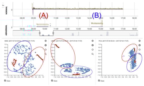 Figure 4 shows network traffic data on Day-2. All abnormal network traffic events were created by using brute force attacks with Patator and a multi-purpose brute-forcer. In detail, the visual patterns that appeared in the morning (A) and afternoon (B) indicate FTP and SSH brute force attacks, respectively. Although there was no difference in normal network traffic patterns throughout the day, the two attack patterns appeared to have different characteristics making them positioned at far distances (see the red-colored network events within the circles in the scatterplots). By default, all selected network events are projected onto the multiple scatterplots with considering date information (using UNIX timestamp). This approach is useful for understanding the changes in network traffic patterns over time. Date and time range selection is added in the parallel coordinates plot to support interactive visual analysis of network traffic events. Whenever a new date and time range is selected, corresponding network events within the range are populated in other visualizations. The user is allowed to exclude the inclusion of the date and time information from each dimension reduction computation by unchecking the checkbox (named “Date”) positioned at the bottom of scatterplots. Identifying the pattern changes of abnormal events over time can be performed by enabling time information. Furthermore, understanding the global network patterns considering both normal and abnormal events is allowed if time information is excluded. Examples of analyzing data without considering time information are added in Section 5.
