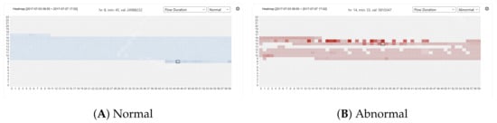 Analyzing network traffic data is difficult due to the size of data is often large. Pixel-view representation is an excellent approach to showing a global layout of the network traffic data [1]. When representing network traffic data with pixels, appropriate pixel size needs to be determined to improve humans’ cognitive ability to understand the meaning of tiny pixel regions. Thus, representing information by measuring the physical size of displays and the number of pixels (defined as “visual scalability”) is essential when displaying large-scale datasets [1,58]. In our system, a heatmap view is added by applying a data aggregation to determine average values in every minute for the user-selected variable and map them to the 24 h projection. Figure 5 shows normal and abnormal heatmap representations of all network traffic on the variable “Flow Duration”. In the view, the user is allowed to change the variable. Whenever the variable is changed, data normalization is applied to show the correct distribution of the selected variable. Gray color attribute is used to indicate no network activity within a specified heatmap cell. Figure 5 represents no network activities from evening to next day morning: 5 p.m. to 8 a.m. A linear color gradient is applied to indicate the min and max of the attribute. Mouse hovering is supported to show the actual value of each heatmap cell.