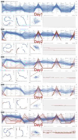 Figure 6 shows a series of visualizations of network traffic events on different days with sixteen DWT features. Since all the detailed analysis views appear on the same page of a web browser, the user can conduct a comparative analysis by evaluating multiple visual representations simultaneously. As discussed above, the CICIDS2017 dataset was created by embedding different daily attack scenarios. When analyzing the raw features data, it was difficult to see the unique differences between normal and abnormal. However, with the DWT features, distinctive patterns were observed. Since there was no abnormal (i.e., attack) activity embedded in Day-1, abnormal activity was not visible in the visualization. However, the abnormal activities on Days 2∼5 show apparent differences compared to the normal activities. In detail, there were high similarities among the abnormal activities on Days 2∼4. However, the activities on Day-5 were completely different. Based on the data description of the CICIDS2017 dataset, we found that three attack scenarios were embedded on Day-5. They are Botnet using ARES (A Command aNd Control server), port scan, and DDoS attack using LOIT (Low Orbit Ion Cannon). Since these attack scenarios were not included in other days, distinctive patterns were observed. We also found similar visual representations when analyzing network patterns that appeared on Day-3 and Day-4, even if different attack scenarios were embedded on these days. We could not locate a major reason causing this result. However, identifying the main cause of this could be vital for elevating our ability to understand network traffic data. Thus, a further study should be performed. When evaluating the scatter plots generated with t-SNE and UMAP (the 1st and 2nd views), we could not identify significant differences between normal and abnormal. However, we found almost complete separation between normal and abnormal when evaluating PCA results on Days 2∼4. The PCA projection on Day-5 indicates a high similarity between normal and abnormal. This would be because port scan activities generated similar network traffic patterns compared to normal network events.