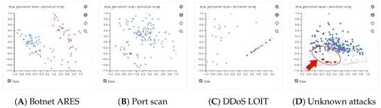 PCA projections on abnormal network activities on Day-5. (A–C) represent known attacks described in the CICIDS2017 dataset. (D) highlights unknown attacks that are detected with the system.